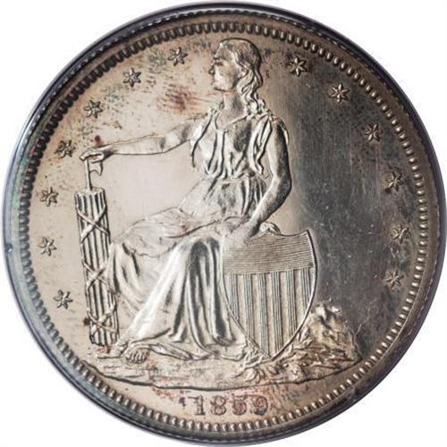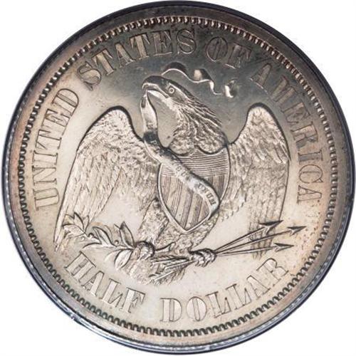 <B>1859 P50C Half Dollar, Judd-235, Pollock-284, R.5, PR63 PCGS.</B></I> Anthony Paquet's Liberty seated design. She faces left, and her hands support a fasces and shield. The reverse depicts an eagle and shield in the center with olive and arrows in the claws. The beak holds a ribbon inscribed E PLURIBUS UNUM. Around, the legend UNITED STATES OF AMERICA with the denomination HALF DOLLAR below. Struck in silver with a reeded edge. This is the broken ribbon Pollock variety with the end of the ribbon on the reverse floating in the field. The bright surfaces are mostly brilliant with scattered russet and blue toning around the margins. In a first generation holder.<BR><BR><b>Shipping:</b> Coins & Currency (<a target="_blank" href="http://www.heritageauctions.com/common/shipping.php">view shipping information</a>)