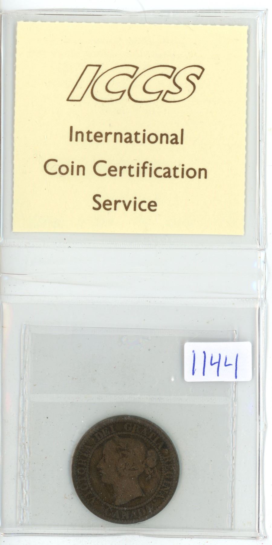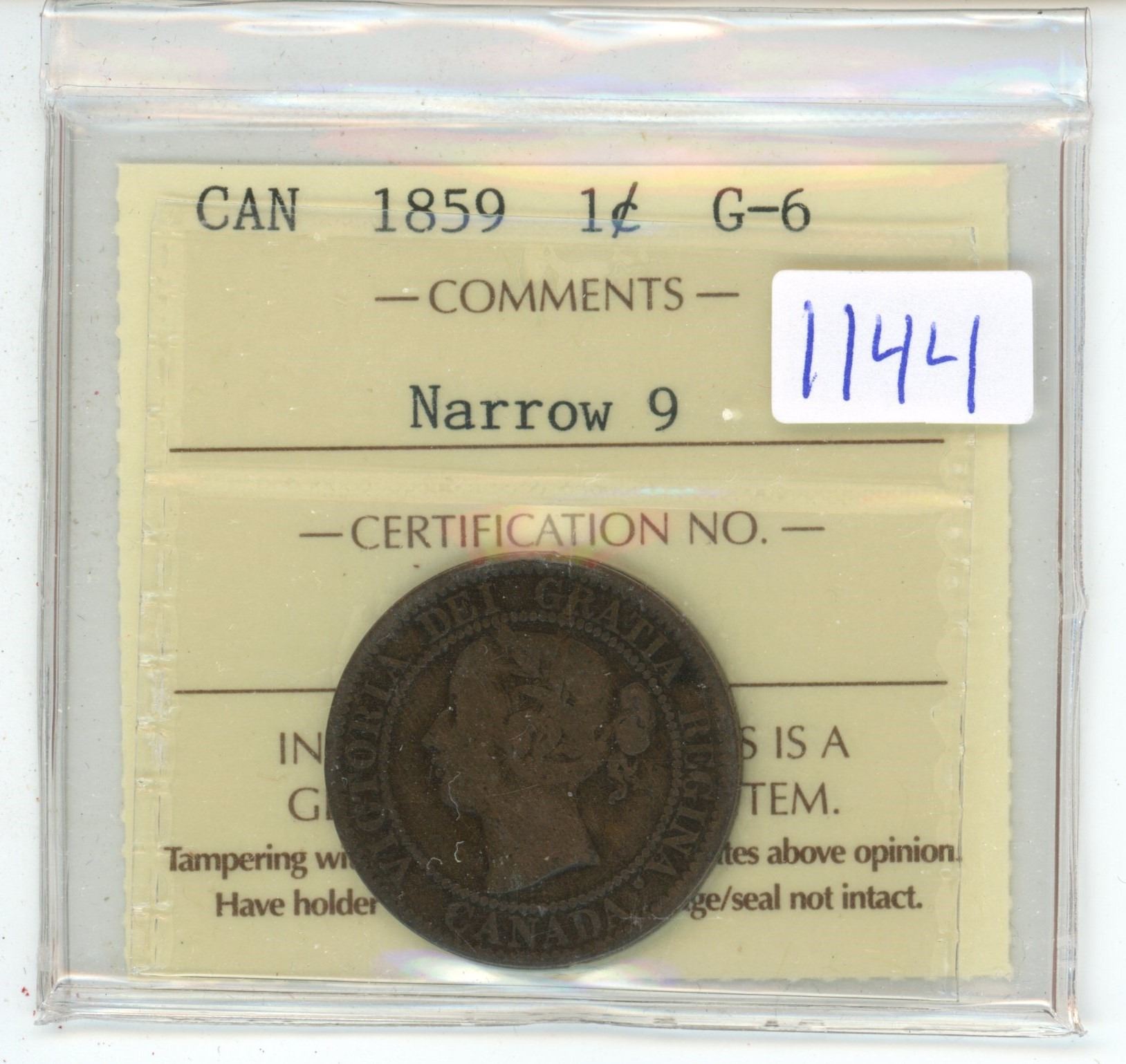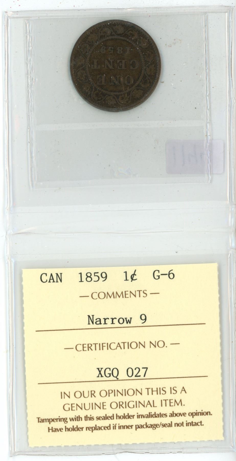 1859 ICCS Graded. Canadian large 1 cent penny coin - G6
