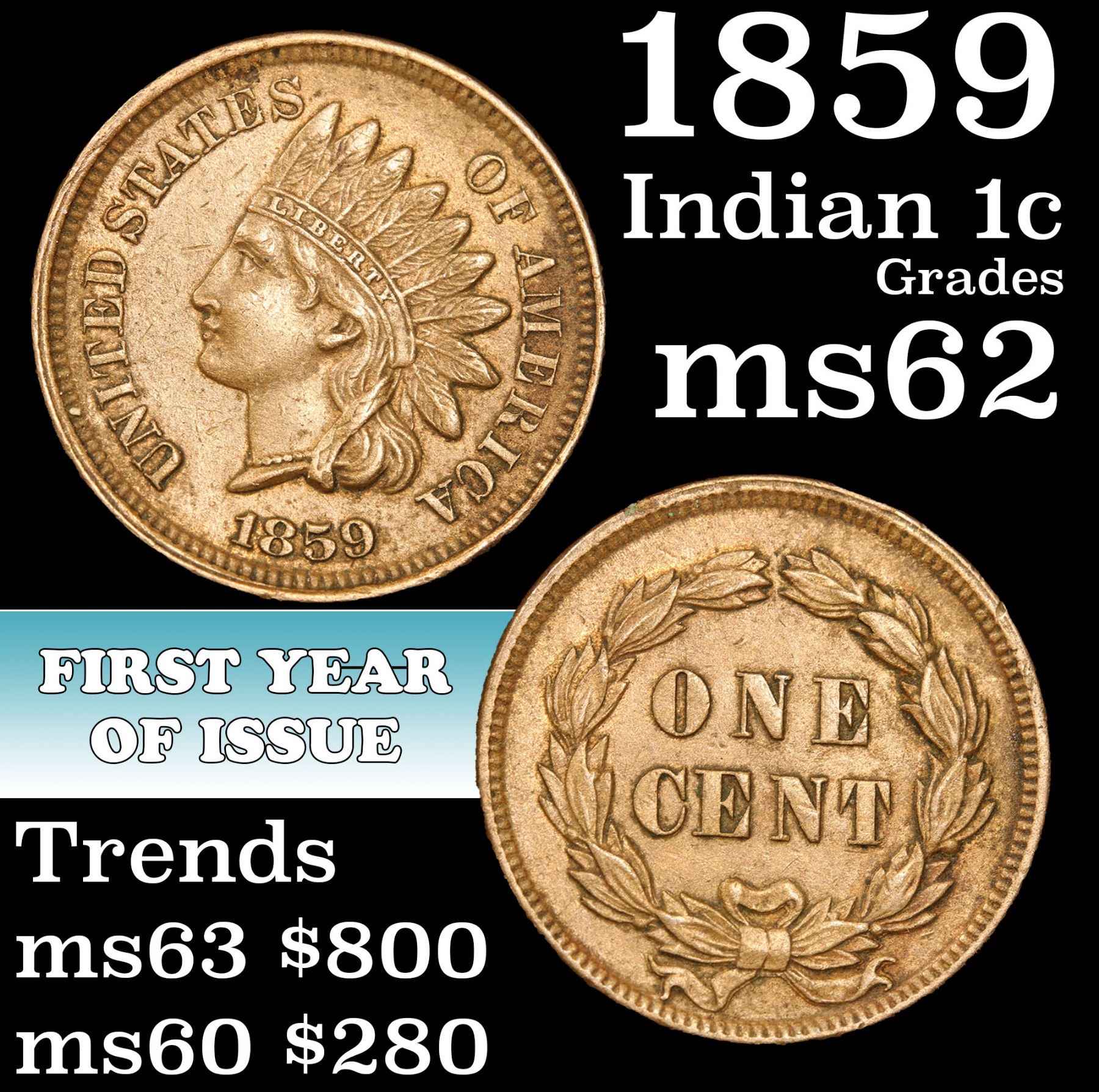 1859 Indian Cent 1c Grades Select Unc.