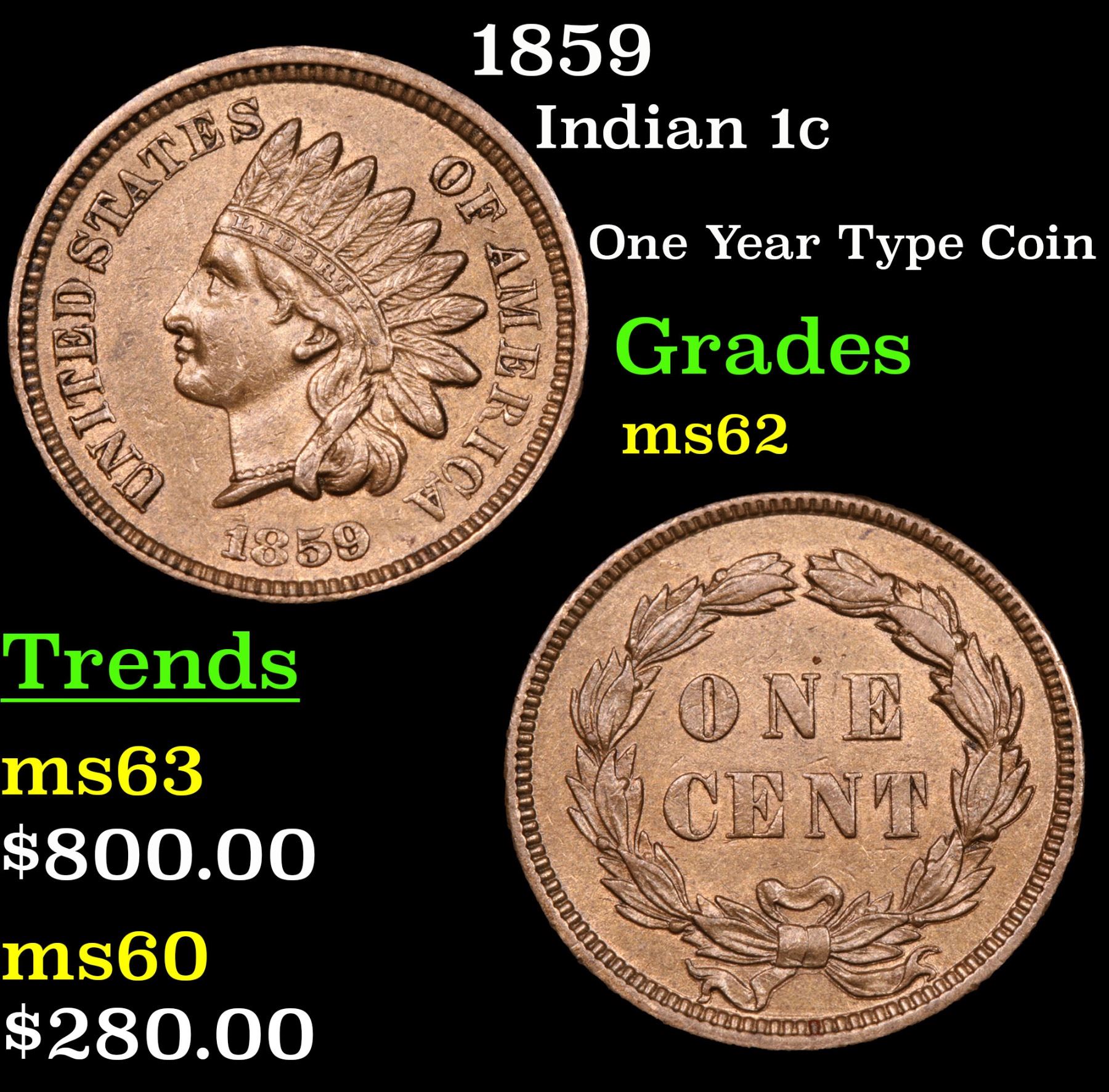 1859 One Year Type Coin . Indian Cent 1c Grades Select Unc.