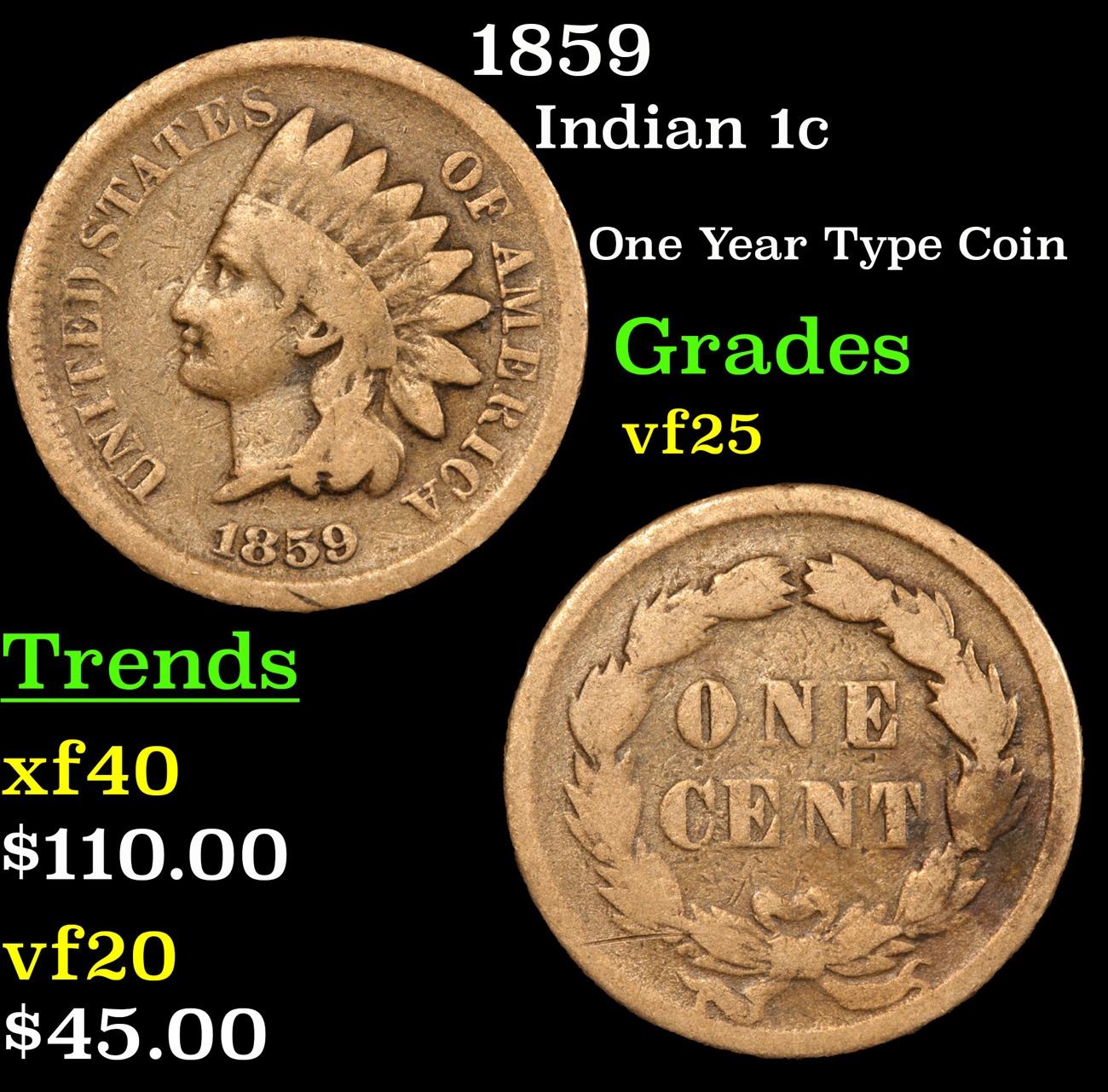 1859 One Year Type Coin . Indian Cent 1c Grades vf+.