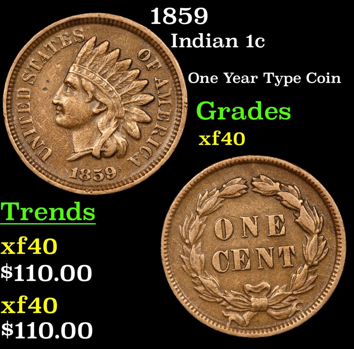 1859 Indian Cent 1c Grades xf.