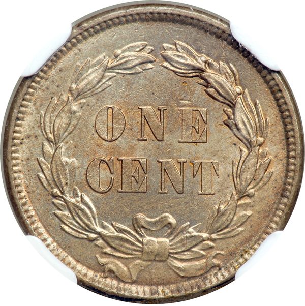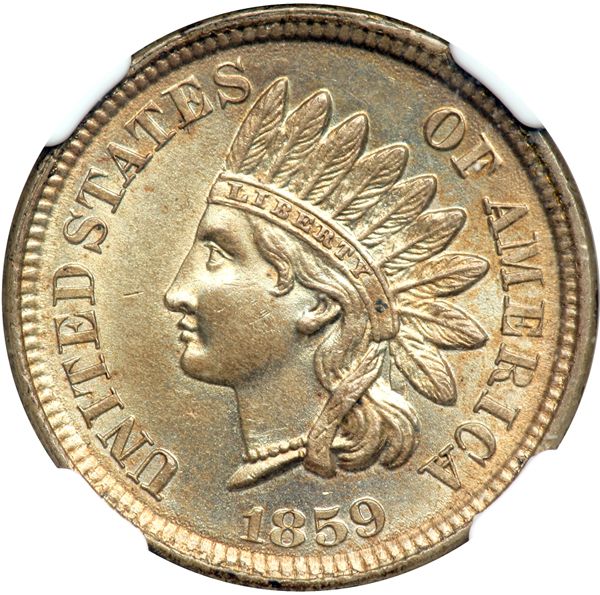 1859 Indian Cent. NGC graded MS-63. Nicely toned which choice detail in the feathers and laurel wreath. The obverse of this one-year Type coin shows UNITED STATES OF AMERICA, an Indian head facing to the left, wearing a feather bonnet. The word LIBERTY is shown on the band across the bonnet, and shows the production date below.