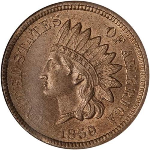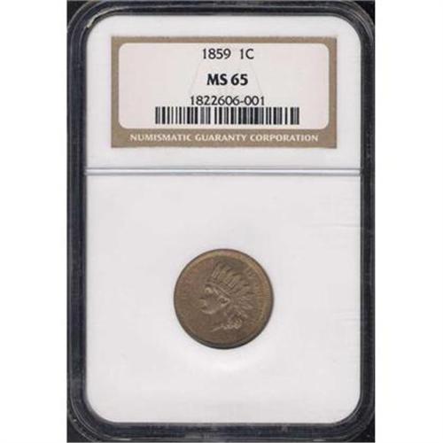 <b>1859 Indian Head Cent. NGC graded MS65.</b> A satiny matte-like gem of this important one-year design, with resilient underlying luster and faint tan-gray toning highlights. From center to periphery, the coin is generally well struck without the usual weakness at the feather tips. On the 1859 issue only, the wreath consists of laurel leaves. Following the change in the design for 1860, this was supplanted with a wreath of oak leaves <b>(PCGS # 2052)</b>