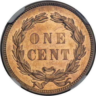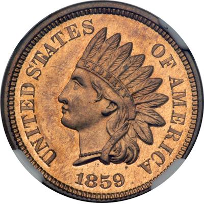 1859 Indian Head Cent. NGC graded Proof 64 Cameo. Nicely toned. Only 800 Proofs struck. A fresh and attractive specimen with choice luster and natural toning on both sides. Somewhat finer than typically seen for the scarce Proof date, a one-year Proof, for that matter, with really decent design details at the feathers and on the laurel wreath (Laurel leaves would give way to an okay wreath the next year.) Pop 16; 14 finer.