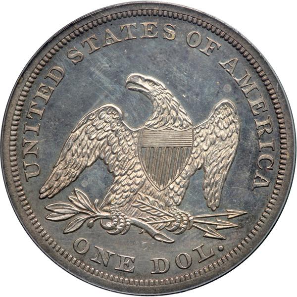 1859 Liberty Seated Dollar. PCGS graded Proof 63. Attractive light golden-lilac toning. Only 800 Proofs struck. An pleasing to believe array of the finer qualities supports bright sharp highlights. Nicely struck with the design comparable to the best preserved Proof specimens of this date. The fields are reflective (in both ways) of its choice Proof 63 grade. Pop 33; 54 finer (PCGS # 7002) .