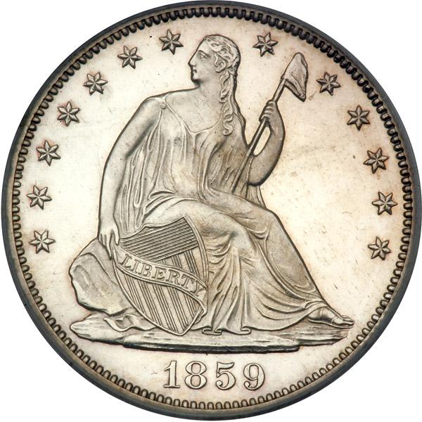 1859 Liberty Seated Half Dollar. PCGS graded Proof 62 Cameo. Only 800 Proofs struck. Untoned. The collectible No Motto dates in this series are 1858-65. Earlier Proofs were minted, but in small numbers and they weren't offered officially to collectors. This is a sharp, keen-edge specimen with all the design details in clear relief. Pop 4; 15 finer (PCGS # 86413) .