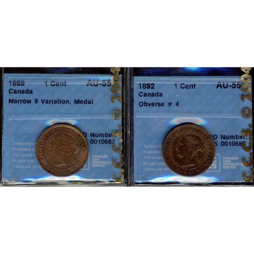 1859 N.9 Variation, medal and 1892 Obv.#4 1¢, both CCCS graded AU-55.