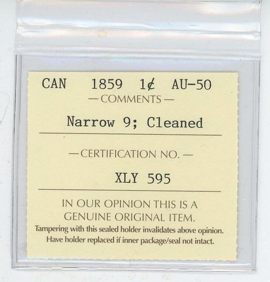 1859 N9 ICCS GRADED CANADIAN LARGE CENT - AU50