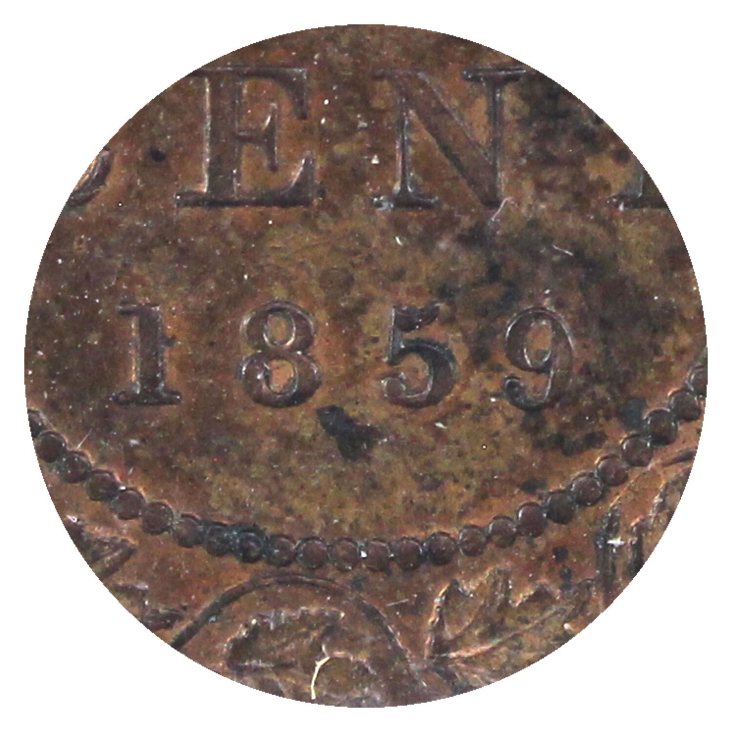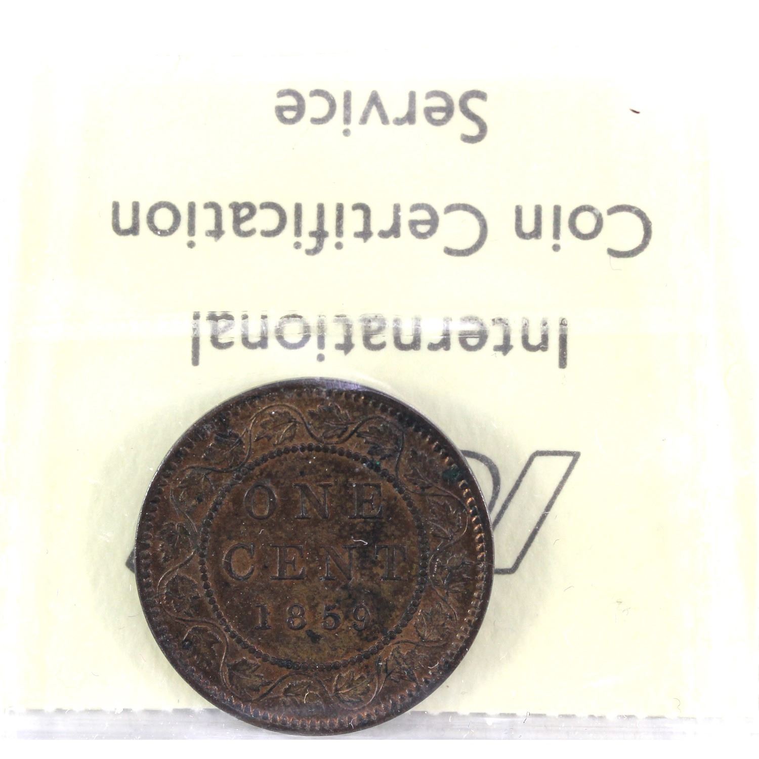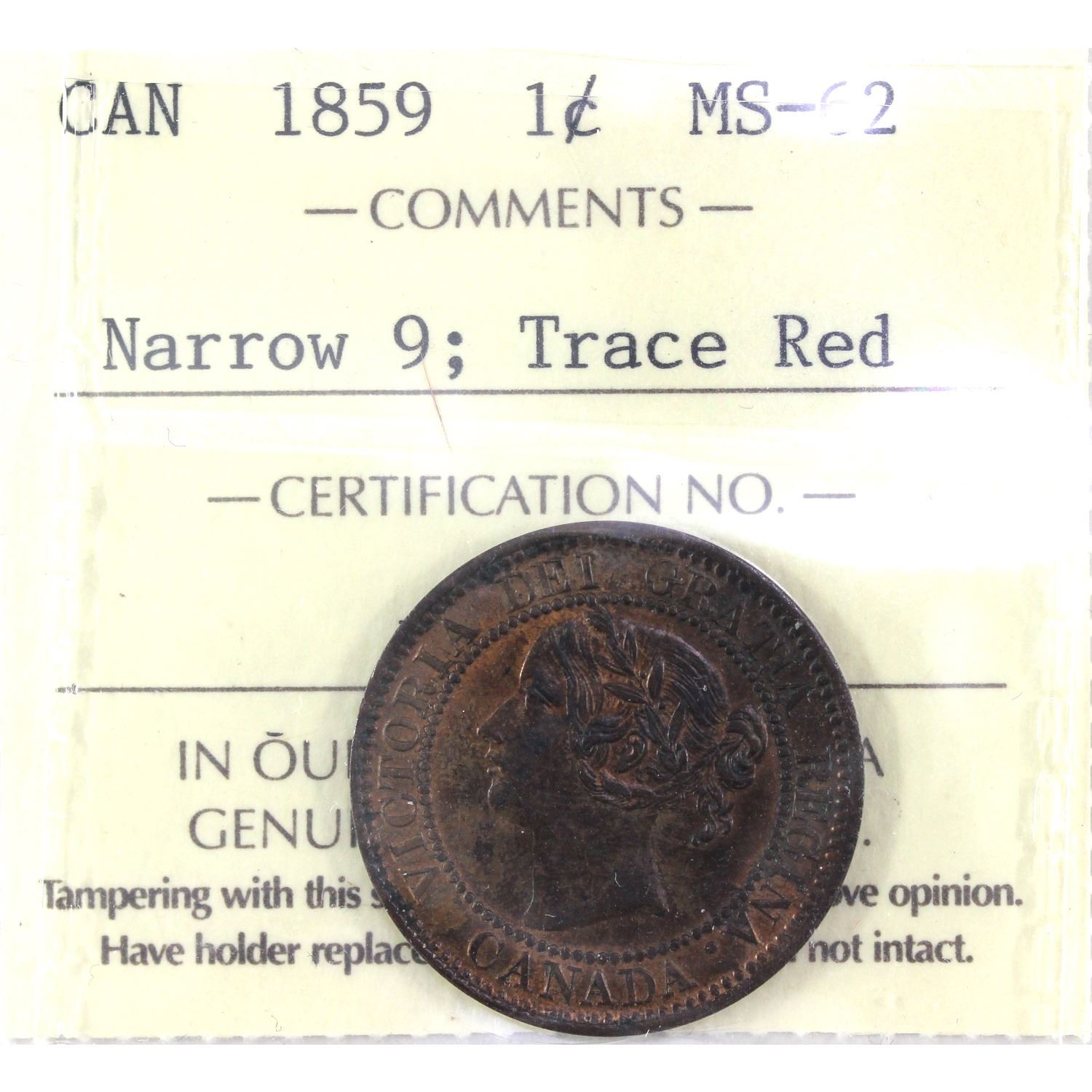 1859 Narrow 9, Canada 1-cent ICCS Certified, MS-62, Trace Red