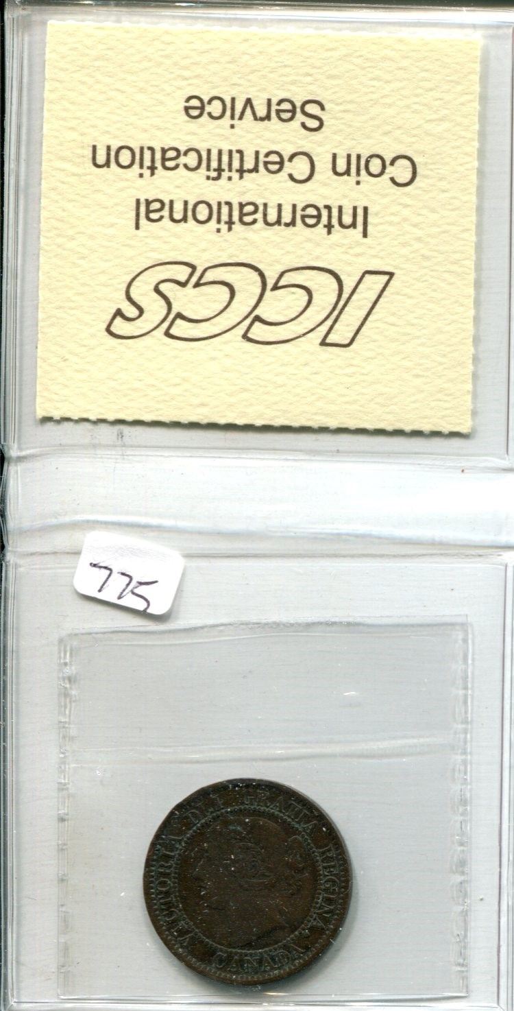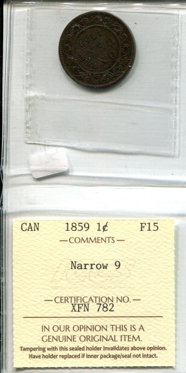 1859 Narrow 9 Canadian Victorian Large Cent. ICCS certified and graded F-15 Narrow 9. Has Rotated Die not listed on holder.