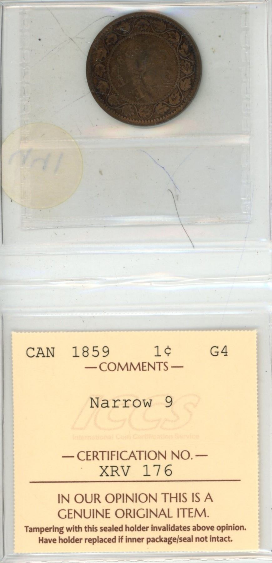 1859 Narrow 9 Canadian Victorian Large Cent. ICCS certified and graded G4.