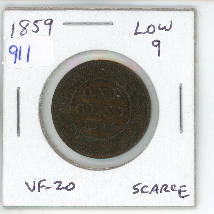 1859 Narrow 9, Low 9 Canadian Victorian Large Cent. VF-20. Scarce.