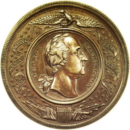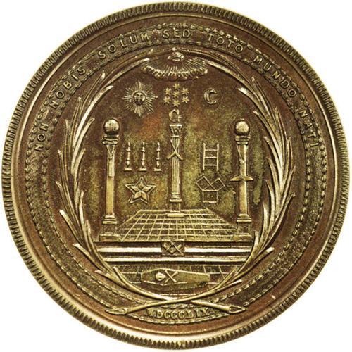 <B>1859 Non Nobis Solum Washington Medal PR64 Uncertified.</B></I> Baker-289a. Bronze. G.H. Lovett's Masonic design. The obverse shows an undraped bust of Washington surrounded by stars and ribbons, an eagle above, and a U.S. shield and arrows below. The reverse contains various Masonic symbols with the phrase Non Nobis Solum Sed Toto Mundo Nati (Born Not For Us Alone But For The Whole World) above. This example was struck in bronze on a thick planchet with engine turned rims. Rich, glossy brown surfaces with no obvious distractions.<BR><I>Ex: Coin Galleries (7/9), lot 149.</B></I>