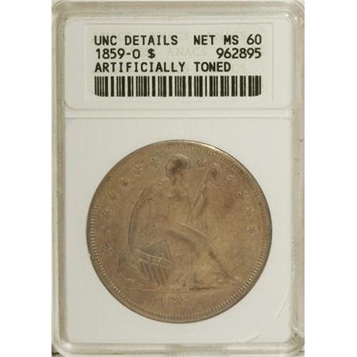 <B>1859-O $1 --Artificially Toned--ANACS. Unc Details, Net MS60.</B></I> NGC Census: (0/0). PCGS Population (0/0). Mintage: 360,000. Numismedia Wsl. Price for NGC/PCGS coin in NG : $11. (#6947)<BR><BR><b>Shipping:</b> Coins & Currency (<a target="_blank" href="http://www.heritageauctions.com/common/shipping.php">view shipping information</a>)
