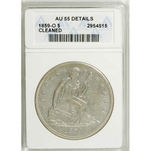 <B>1859-O $1 --Cleaned--ANACS. AU55 Details.</B></I> NGC Census: (21/285). PCGS Population (48/389). Mintage: 360,000. Numismedia Wsl. Price: $575. (#6947)<BR><BR><b>Shipping:</b> Coins & Currency (<a target="_blank" href="http://www.heritageauctions.com/common/shipping.php">view shipping information</a>)