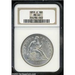 <table><tr><td><TABLE cellSpacing=0 cellPadding=0 width="100%" bgColor=#000000 border=0><TBODY> <TR><TD width="100%"><TABLE cellSpacing=1 cellPadding=3 width="100%" border=0><TBODY><TR><TD width="100%" bgColor=#79735c><FONT face=arial color=#ffffff size=3><B>Description</B> </FONT></TD></TR><TR><TD width="100%" bgColor=#ffffff><FONT face=arial size=2><B>1859-O $1 MS63 NGC.</B></I> Prior to the Treasury releases of the early 1960s, the 1859-O was a scarce, yet not rare coin in Mint State. By 1964, however, at least three 1,000-coin bags of Mint State 1859-O Seated Dollars emerged from Treasury Department vaults and found their way into the hands of the public. These coins are uniformly frosty in texture with mostly untoned surfaces and enough scattered bagmarks to net grades in the MS60-62 range. This example fits the bill with a nice strike, full mint frost, lightly abraded surfaces and a dash of rose color. </FONT></TD></TR></TBODY></TABLE></TD></TR></TBODY></TABLE><BR><A name=PricesRealized></A><TABLE cellSpacing=0 cellPadding=0 width="100%" bgColor=#000000 border=0><TBODY><TR><TD width="100%"><TABLE cellSpacing=1 cellPadding=3 width="100%" border=0><TBODY><TR><TD width="100%" bgColor=#79735c><A name=PR><FONT face=arial color=#ffffff size=3><B>Previous Prices from Heritage Auctions</B> </FONT></A></TD></TR><TR><TD bgColor=#f6f6ed><TABLE cellSpacing=0 cellPadding=0 width="100%" border=1><TBODY><TR><TD align=middle width="33%"><B>Date</B></TD><TD align=middle width="33%"><B>Service</B></TD><TD align=middle width="33%"><B>Price</B></TD></TR><TR bgColor=whitesmoke><TD width="33%"><B>08/07/1998</B></TD><TD width="33%">PCGS</TD><TD width="33%">$2,875.00</TD></TR><TR bgColor=whitesmoke><TD width="33%"><B>02/03/1995</B></TD><TD width="33%">NGC</TD><TD width="33%">$1,925.00</TD></TR><TR bgColor=whitesmoke><TD width="33%"><B>06/01/2000</B></TD><TD width="33%">NGC</TD><TD width="33%">$1,783.00</TD></TR><TR bgColor=whitesmoke><TD width="33%"><B>08/01/1999</B></TD><TD width="33%">PCGS</TD><TD width="33%">$2,070.00</TD></TR><TR bgColor=whitesmoke><TD width="33%"><B>11/01/1999</B></TD><TD width="33%">PCGS</TD><TD width="33%">$1,840.00</TD></TR></TBODY></TABLE></TD></TR><TR><TD bgColor=#ffffff><FONT face=arial size=1 ?>PLEASE NOTE: All prices realized reflect the final hammer price PLUS the buyer's premium in auctions that charge a buyer's premium. Each item has a notation at the top of the listing indicating whether that lot included a buyer's premium. Example: A item that sells with a final hammer price of $100 and a 20% buyer's premium will display with a price realized of $120. All information listed is intended to be as accurate as possible, but errors are possible. Please use this guide carefully and inform us of any inaccuracies. </FONT></TD></TR></TBODY></TABLE></TD></TR></TBODY></TABLE><BR><TABLE cellSpacing=0 cellPadding=0 width="100%" bgColor=#000000 border=0><TBODY><TR><TD width="100%"><TABLE cellSpacing=1 cellPadding=3 width="100%" border=0><TBODY><TR><TD width="100%" bgColor=#79735c colSpan=6><FONT face=arial color=#ffffff size=3><B>Price Guide*</B> </FONT></TD></TR><TR bgColor=#f6f6ed><TD align=middle><B>Grade</B> </TD><TD align=middle><B>Coin World<BR>(Trends)</B> </TD><TD align=middle><B>Numismedia<BR>Retail</B> </TD><TD align=middle><B>Numismedia<BR>Wholesale</B> </TD><TD align=middle><B>Coin<BR>Universe</B> </TD><TD align=middle><B>Heritage<BR>Value Index</B> </TD></TR><TR bgColor=#ffffff><TD align=middle>62</TD><TD align=right>$1,800.00</TD><TD align=right>---</TD><TD align=right>$1,050.00</TD><TD align=right>---</TD><TD align=right>$1,836.42</TD></TR><TR style="FONT-WEIGHT: bold" bgColor=#cccfdd><TD align=middle>63</TD><TD align=right>$3,500.00</TD><TD align=right>---</TD><TD align=right>$2,225.00</TD><TD align=right>$7,150.00</TD><TD align=right>$2,882.00</TD></TR><TR bgColor=#ffffff><TD align=middle>64</TD><TD align=right>---</TD><TD align=right>---</TD><TD align=right>$6,350.00</TD><TD align=right>$9,500.00</TD><TD align=right>$6,070.00</TD></TR><TR bgColor=#ffffff><TD colSpan=6><FONT size=1>*All information listed is intended to be as accurate as possible, but errors are possible. No item may be returned or refused based on this information which is provided as a service to our customers. You should contact each pricing source directly to determine the accuracy of this information. </FONT></TD></TR></TBODY></TABLE></TD></TR></TBODY></TABLE><BR><TABLE cellSpacing=0 cellPadding=0 width="100%" bgColor=#000000 border=0><TBODY><TR><TD width="100%"><TABLE cellSpacing=1 cellPadding=3 width="100%" border=0><TBODY><TR><TD width="100%" bgColor=#79735c><FONT face=arial color=#ffffff size=3><B>Population Guide</B> </FONT></TD></TR><TR bgColor=#ffffff><TD align=middle><!-- Begin Output of Population Grid--><TABLE cellSpacing=0 cellPadding=0 width="100%" border=0><TBODY><TR><TD vAlign=center><TABLE cellSpacing=0 width="100%" border=1 cellsadding="3"><TBODY><TR><TD vAlign=center><TABLE cellSpacing=0 cellPadding=3 width="100%" border=1><TBODY><TR><TD vAlign=center align=middle bgColor=#f0f1e8 colSpan=2 <CENTER><FONT face=Arial size=2><B>PCGS Pop </B></FONT><CENTER></CENTER></TD><TD vAlign=center align=middle bgColor=#f0f1e8 colSpan=2><CENTER><FONT face=Arial size=2><B>NGC Pop</B></CENTER></FONT></TD></TR><TR><TD vAlign=center><FONT face=Arial size=2>(63)</FONT> </TD><TD vAlign=center align=right><FONT face=Arial size=2>33</FONT> </TD><TD vAlign=center><FONT face=Arial size=2>(63)</FONT> </TD><TD vAlign=center align=right><FONT face=Arial size=2>19</FONT> </TD></TR><TR><TD vAlign=center><FONT face=Arial size=2>(>63)</FONT> </TD><TD vAlign=center align=right><FONT face=Arial size=2>16</FONT> </TD><TD vAlign=center><FONT face=Arial size=2>(>63)</FONT> </TD><TD vAlign=center align=right><FONT face=Arial size=2>18</FONT> </TD></TR></TBODY></TABLE></TD></TR></TBODY></TABLE></TD></TR></TBODY></TABLE><!-- End Output of Population Grid--></TD></TR></TBODY></TABLE></TD></TR></TBODY></TABLE><BR><TABLE c
