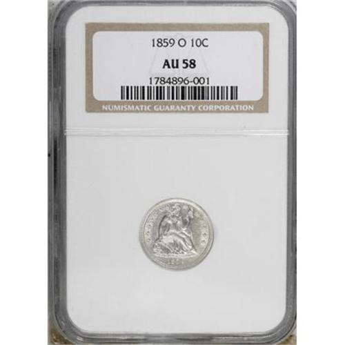 <B>1859-O 10C AU58 NGC.</B></I> NGC Census: (12/79). PCGS Population (6/83). Mintage: 480,000. Numismedia Wsl. Price for NGC/PCGS coin in AU58: $225. (#4620)<BR><BR><B>Coin Engraver:</B> Christian Gobrecht<BR><BR><b>Shipping:</b> Coins & Currency (<a target="_blank" href="http://www.heritageauctions.com/common/shipping.php">view shipping information</a>)
