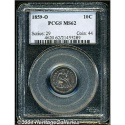 <B>1859-O<10C> MS62 PCGS.</B></I> Pale violet toning overlays bright surfaces that exhibit sharply defined design elements. A few trivial marks are seen on the obverse. Population: 12 in 62, 67 finer (9/04). <BR><BR><B>Important notice:</B> Heritage usually auctions material at the rate of 200-250 lots per hour. On some occasions eBay Live bid software or the Internet may not be able to keep up with the pace of the auction. We recommend placing a realistic absentee bid now as insurance to avoid disappointment. Occasionally the auctioneer may eliminate or reject an eBay Live bid, and the auctioneer may also reopen a lot after the close of the eBay live bidding (usually because we missed an audience bid), and may reject your bid even if it shows you as the winning bidder. By bidding via eBay Live, you agree that Heritage may award the lot to another bidder at its sole discretion under the circumstances described above or any other reasonable circumstances. Since eBay bids are not shown to us until we open the lot on the floor, we treat those bids just like floor bids. In most cases the floor responds before the eBay bid is presented to us, due to Internet lag time, so for consistency we have made it a policy that floor bids are always considered first over tie eBay live bids. Also please note that all Heritage lots purchased through eBay Live carry a 20% Buyer's Premium. Please make sure you read the Terms and Conditions before you bid.