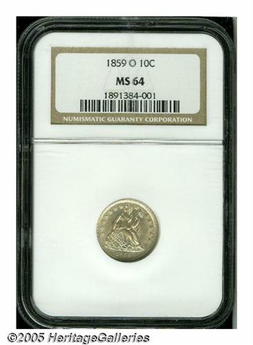<B>1859-O<10C> MS64 NGC.</B></I> Boldly struck and untoned, with scintillating luster and essentially blemish-free surfaces. Die clash marks (as struck) are apparent near the reverse center. Although 480,000 pieces were coined, few have survived in Mint State.