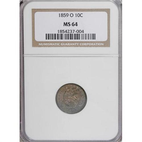 <B>1859-O 10C MS64 NGC.</B></I> The pleasing design details are well defined on this originally toned near-Gem, with only a touch of weakness noted on the top of Liberty's head and on the right side obverse stars. Deep plum coloration adorns the central regions, yielding to electric-blue toning near the borders. Clash marks are noticeable near the reverse center, but abrasions are nowhere to be seen. Census: 24 in 64, 33 finer (6/07). <BR><BR><b>Shipping:</b> Coins & Currency (<a target="_blank" href="http://www.heritageauctions.com/common/shipping.php">view shipping information</a>)