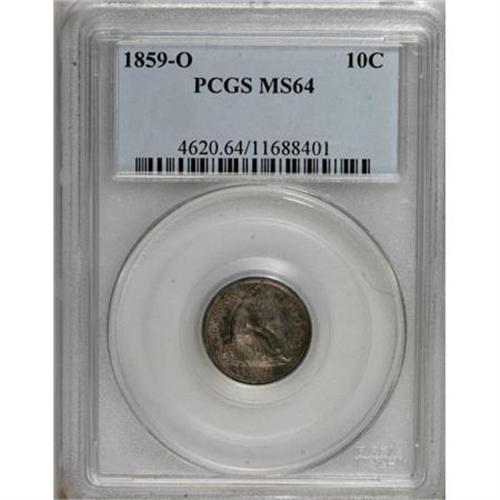 <B>1859-O 10C MS64 PCGS.</B></I> This antebellum dime issue has a mintage of only 480,000 pieces, and this attractively toned near-Gem ranks among the best survivors. The coin is well struck and luminous beneath plum, pink, and peach patina. Population: 30 in 64, 20 finer (8/07).<BR><BR><B>Coin Engraver:</B> Christian Gobrecht<BR><BR><b>Shipping:</b> Coins & Currency (<a target="_blank" href="http://www.heritageauctions.com/common/shipping.php">view shipping information</a>)