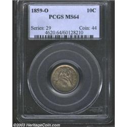 <TABLE cellSpacing=0 cellPadding=0 width="100%" bgColor=#000000 border=0><TBODY><TR><TD width="100%"><TABLE cellSpacing=1 cellPadding=3 width="100%" border=0><TBODY><TR><TD width="100%" bgColor=#79735c><FONT face=arial color=#ffffff size=3><B>Description</B> </FONT></TD></TR><TR><TD width="100%" bgColor=#ffffff><FONT face=arial size=2><B>1859-O 10C MS64 PCGS.</B></I> The obverse has intermingled apple-green and lavender hues, while the reverse has lighter dove-gray color. A sharply struck near-Gem with complete satiny luster and a well preserved obverse. Scarce in Uncirculated grades. Population: 28 in 64, 18 finer (4/03).<BR><I>Ex: G.N.A. Sale (Mid-American, 5/1987), lot 867, where it realized $1,980.</B></I> </FONT></TD></TR></TBODY></TABLE></TD></TR></TBODY></TABLE><BR><A name=PricesRealized></A><TABLE cellSpacing=0 cellPadding=0 width="100%" bgColor=#000000 border=0><TBODY><TR><TD width="100%"><TABLE cellSpacing=1 cellPadding=3 width="100%" border=0><TBODY><TR><TD width="100%" bgColor=#79735c><A name=PR><FONT face=arial color=#ffffff size=3><B>Previous Prices from Heritage Auctions</B> </FONT></A></TD></TR><TR><TD bgColor=#f6f6ed><TABLE cellSpacing=0 cellPadding=0 width="100%" border=1><TBODY><TR><TD align=middle width="33%"><B>Date</B></TD><TD align=middle width="33%"><B>Service</B></TD><TD align=middle width="33%"><B>Price</B></TD></TR><TR bgColor=whitesmoke><TD width="33%"><B>03/21/2002</B></TD><TD width="33%">PCGS</TD><TD width="33%">$1,035.00</TD></TR><TR bgColor=whitesmoke><TD width="33%"><B>02/24/2002</B></TD><TD width="33%">PCGS</TD><TD width="33%">$1,495.00</TD></TR><TR bgColor=whitesmoke><TD width="33%"><B>03/19/1997</B></TD><TD width="33%">PCGS</TD><TD width="33%">$825.00</TD></TR><TR bgColor=whitesmoke><TD width="33%"><B>01/05/2001</B></TD><TD width="33%">PCGS</TD><TD width="33%">$920.00</TD></TR><TR bgColor=whitesmoke><TD width="33%"><B>10/06/2001</B></TD><TD width="33%">NGC</TD><TD width="33%">$833.75</TD></TR><TR bgColor=whitesmoke><TD width="33%"><B>11/01/1997</B></TD><TD width="33%">NGC</TD><TD width="33%">$935.00</TD></TR><TR bgColor=whitesmoke><TD width="33%"><B>11/21/1997</B></TD><TD width="33%">NGC</TD><TD width="33%">$715.00</TD></TR></TBODY></TABLE></TD></TR><TR><TD bgColor=#ffffff><FONT face=arial size=1 ?>PLEASE NOTE: All prices realized reflect the final hammer price PLUS the buyer's premium in auctions that charge a buyer's premium. Each item has a notation at the top of the listing indicating whether that lot included a buyer's premium. Example: A item that sells with a final hammer price of $100 and a 20% buyer's premium will display with a price realized of $120. All information listed is intended to be as accurate as possible, but errors are possible. Please use this guide carefully and inform us of any inaccuracies. </FONT></TD></TR></TBODY></TABLE></TD></TR></TBODY></TABLE><BR><TABLE cellSpacing=0 cellPadding=0 width="100%" bgColor=#000000 border=0><TBODY><TR><TD width="100%"><TABLE cellSpacing=1 cellPadding=3 width="100%" border=0><TBODY><TR><TD width="100%" bgColor=#79735c colSpan=6><FONT face=arial color=#ffffff size=3><B>Price Guide*</B> </FONT></TD></TR><TR bgColor=#f6f6ed><TD align=middle><B>Grade</B> </TD><TD align=middle><B>Coin World<BR>(Trends)</B> </TD><TD align=middle><B>Numismedia<BR>Retail</B> </TD><TD align=middle><B>Numismedia<BR>Wholesale</B> </TD><TD align=middle><B>Coin<BR>Universe</B> </TD><TD align=middle><B>Heritage<BR>Value Index</B> </TD></TR><TR bgColor=#ffffff><TD align=middle>63</TD><TD align=right>$650.00</TD><TD align=right>$520.00</TD><TD align=right>$433.00</TD><TD align=right>$575.00</TD><TD align=right>$420.83</TD></TR><TR style="FONT-WEIGHT: bold" bgColor=#cccfdd><TD align=middle>64</TD><TD align=right>$1,250.00</TD><TD align=right>---</TD><TD align=right>$935.00</TD><TD align=right>$1,025.00</TD><TD align=right>$825.00</TD></TR><TR bgColor=#ffffff><TD align=middle>65</TD><TD align=right>---</TD><TD align=right>---</TD><TD align=right>$2,175.00</TD><TD align=right>$3,100.00</TD><TD align=right>$1,936.67</TD></TR><TR bgColor=#ffffff><TD colSpan=6><FONT size=1>*All information listed is intended to be as accurate as possible, but errors are possible. No item may be returned or refused based on this information which is provided as a service to our customers. You should contact each pricing source directly to determine the accuracy of this information. </FONT></TD></TR></TBODY></TABLE></TD></TR></TBODY></TABLE><BR><TABLE cellSpacing=0 cellPadding=0 width="100%" bgColor=#000000 border=0><TBODY><TR><TD width="100%"><TABLE cellSpacing=1 cellPadding=3 width="100%" border=0><TBODY><TR><TD width="100%" bgColor=#79735c><FONT face=arial color=#ffffff size=3><B>Population Guide</B> </FONT></TD></TR><TR bgColor=#ffffff><TD align=middle><!-- Begin Output of Population Grid--><TABLE cellSpacing=0 cellPadding=0 width="100%" border=0><TBODY><TR><TD vAlign=center><TABLE cellSpacing=0 width="100%" border=1 cellsadding="3"><TBODY><TR><TD vAlign=center><TABLE cellSpacing=0 cellPadding=3 width="100%" border=1><TBODY><TR><TD vAlign=center align=middle bgColor=#f0f1e8 colSpan=2 <CENTER><FONT face=Arial size=2><B>PCGS Pop </B></FONT><CENTER></CENTER></TD><TD vAlign=center align=middle bgColor=#f0f1e8 colSpan=2><CENTER><FONT face=Arial size=2><B>NGC Pop</B></CENTER></FONT></TD></TR><TR><TD vAlign=center><FONT face=Arial size=2>(64)</FONT> </TD><TD vAlign=center align=right><FONT face=Arial size=2>28</FONT> </TD><TD vAlign=center><FONT face=Arial size=2>(64)</FONT> </TD><TD vAlign=center align=right><FONT face=Arial size=2>25</FONT> </TD></TR><TR><TD vAlign=center><FONT face=Arial size=2>(>64)</FONT> </TD><TD vAlign=center align=right><FONT face=Arial size=2>18</FONT> </TD><TD vAlign=center><FONT face=Arial size=2>(>64)</FONT> </TD><TD vAlign=center align=right><FONT face=Arial size=2>26</FONT> </TD></TR></TBODY></TABLE></TD></TR></TBODY></TABLE></TD></TR></TBODY></TABLE><!-- End Output of Population Grid--> Important notice: Heritage usually a