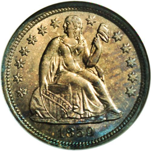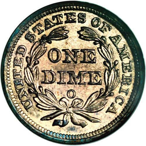 <B>1859-O<10C> MS65 NGC.</B></I> Medium O. Fortin-103. A lustrous Gem with rich plum and blue-green toning. The strike is excellent aside from a hint of softness on the right ribbon end and Liberty's hair. Boldly clashed throughout ONE DIME. The final year of the Stars Obverse type. Census: 18 in 65, 16 finer (4/06).