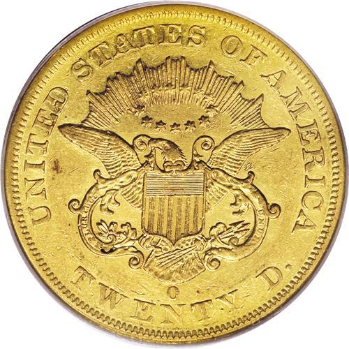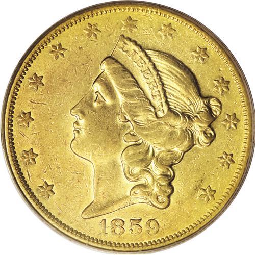 <B>1859-O $20 AU50 PCGS.</B></I> The elusive nature of this coin begins with its minuscule mintage, only 9,100 pieces in pre-Civil War New Orleans. Most of the issue that survives is well circulated, with the average example grading Very Fine or Extra Fine. Gold experts Jeff Garrett and Ron Guth write: "The population and auction data confirm that this coin is rare in any grade. The 1859-O double eagle is the third rarest issue from the New Orleans Mint, exceeded only the ultra-rare 1854-O and 1856-O issues. Most of the coins offered are Very Fine or Extremely Fine, and many of those display heavy bagmarks or damage." Unlike certain other dates that were once considered rare but now much more plentiful due to the recent discovery of extensive ship treasure, just two examples of this rarity were found among treasure on the <I>S.S. Republic.</B></I> The <I>S.S. Brother Jonathan</B></I> did not have any examples, and the <I>S.S. Central America</B></I> went down two years earlier in 1857.<BR> The present example is refreshingly free of major surface distractions, although myriad tiny contact marks that appear under a strong loupe attest to a short stay in circulation. The only singular mark is a small scrape on Liberty's chin. Despite those marks, the surfaces show considerable prooflike luster remaining, easily visible in the protected areas around the periphery of each side. The coloration is golden-orange, with a tinge of greenish-gold near the date. Population: 8 in 50, 19 finer (4/07).<BR><BR><b>Shipping:</b> Coins & Currency (<a target="_blank" href="http://www.heritageauctions.com/common/shipping.php">view shipping information</a>)