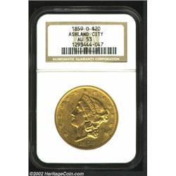 1859-O $20 AU53 NGC. In 1992, Doug Winter ranked the 1859-O as the third rarest O-mint Double Eagle after the 1856-O and 1854-O. When he helped us catalog the Eagle Collection that sold as part of our January 2002 FUN Signature Sale, however, he readjusted the rarity ranking of the '59-O to fourth after the 1856-O, 1854-O, and 1855-O. There can be little doubt that the present issue still ranks as one of the most significant gold rarities from the New Orleans Mint. A mere 9,100 pieces were produced, and no more than 85 coins are believed extant in all grades. While as many as 20 of these coins grade AU, most are heavily abraded and display evidence of having been cleaned at one time or another. The present example, on the other hand, is problem-free for a branch mint Twenty at the AU53 level of preservation. Both sides retain traces of a semi-prooflike finish--the finish often encountered on survivors of this issue. True, the surfaces are extensively abraded, but there are no singularly distracting handling marks. The strike is average, but the main design elements exhibit suitably bold definition. The clashmarks that are typically associated with this issue are not readily evident in the center of the obverse, a fact that could suggest a very early die state. This coin is identical in grade to the PCGS-certified example that realized $14,950 as lot 1732 in Bowers and Merena's October 1999 sale of Part II of the Harry W. Bass, Jr. Collection. We have not offered an example at this grade level since 1992, although we did sell an AU58 NGC representative (lot 4025, realized $26,450) as part of the aforementioned Eagle Collection. Any 1859-O Double Eagle that grades at least AU53 qualifies for Condition Census standing.From the Ashland City Collection. Important notice: We expect to be auctioning lots at the rate of 200-250 per hour. Sometimes eBay Premier live bid software cannot keep up with that pace, so we strongly recommend that you place a realistic proxy bid now as insurance to avoid disappointment. Also please note that all Heritage/CAA lots purchased through eBay Premier carry a 20% Buyer's Premium. Please make sure you read the Terms and Conditions.