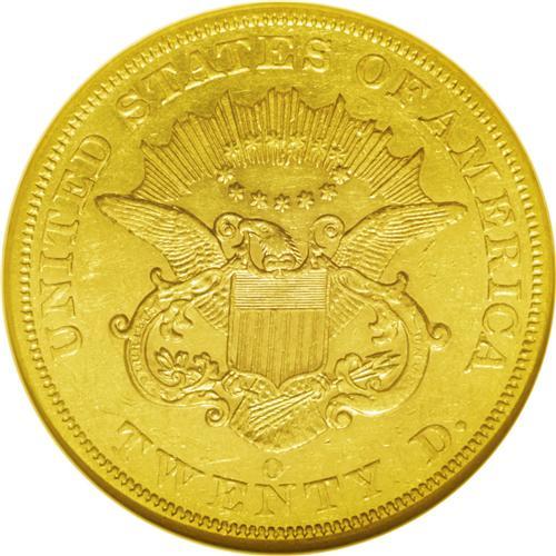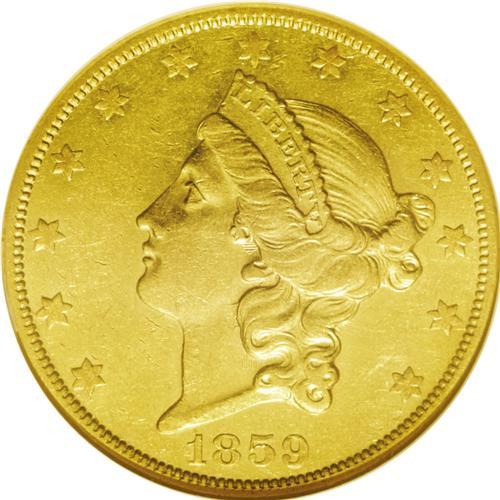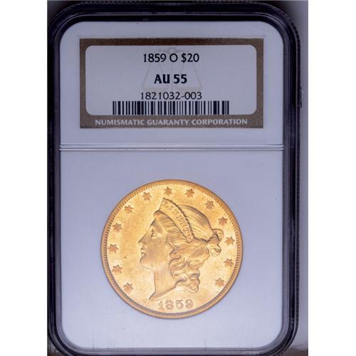 <B>1859-O<$20> AU55 NGC.</B></I> After the three stoppers in the Type One double eagle series (1861 Paquet, 1856-O, and 1854-O), this issue is the fifth rarest in the series, right behind the 1855-O double eagle. In 1859, the New Orleans Mint only produced 9,100 double eagles, and our best estimate suggests that less than 1% of the total still survive today. When David Akers studied double eagle auction appearances a quarter century ago, he felt that this date was not quite as rare as the 1860-O double eagle, and further commented: "The 1859-O is sufficiently rare that it ranks in the top 10% of the entire series according to rarity based on both average grade and frequency of appearance."<BR> We suspect that this example falls within the Condition Census for the date, and it was this grade range that is considered a requirement for the Census according to Winter and Crum. This duo related the rarity and quality of this issue: "The 1859-O is a very scarce issue in all grades. It is most often seen in the Very Fine to Extremely Fine grades and it is rare in About Uncirculated. Most pieces in this grade range are no better than About Uncirculated-53 and the 1859-O becomes very rare in About Uncirculated-55. There is currently only one Uncirculated coin known: a PCGS Mint State-60 in a prominent Midwestern collection."<BR> This example is rather indecisively struck with considerable peripheral weakness, especially among the stars on the obverse. The quality of the surfaces make up for the weakness of strike, as there are essentially no visible abrasions or distractions of any type. Bright green-gold color is evident with traces of rose overtones. Much of the original prooflike surface is still visible on each side. The obverse of this specimen has heavy clash marks, similar to lot 1731 in the October 1999 sale of the Harry Bass Collection. While Winter and Crum suggest that