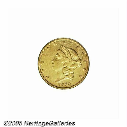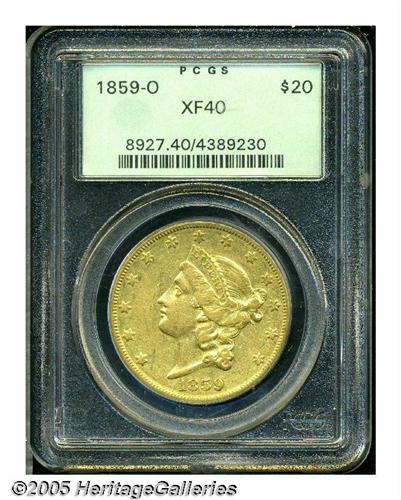 <B>1859-O<$20> XF40 PCGS.</B></I> An important scarcity among O-mint Double Eagles, ranking below only the more heralded 1854-O and 1856-O. The strike is strong for an O-mint, and the surfaces, while they exhibit some residual luster, show the normal marks one might expect of this grade. A much underrated issue. Population: 4 in 40, 34 finer (5/05).