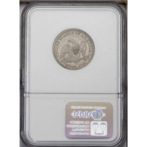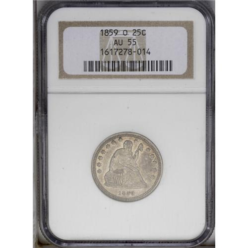<B>1859-O<25C> AU55 NGC.</B></I> This richly detailed piece is draped in medium dove-gray and olive colors. Distracting marks are not to be found, and wear is generally limited to Liberty's thigh. A very scarce issue in better circulated grades.