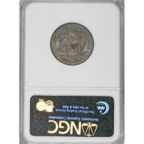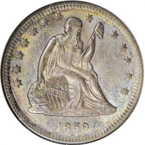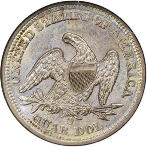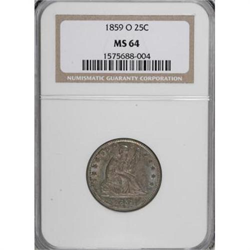 <B>1859-O 25C MS64 NGC.</B></I> Larry Briggs, in his Seated Liberty quarter book, says the 1859-O "... is fairly common in low grades and readily available up to AU grades. Unc's are quite rare ... ." Lustrous surfaces on this near-Gem are dominated by bluish-gray toning, and accented with gold and lilac. Sharply struck, except for the usual softness in the star centers. A few unobtrusive handling marks preclude full Gem classification. Census: 6 in 64, 4 finer (8/07).<BR><BR><B>Coin Engraver:</B> Christian Gobrecht<BR><BR><b>Shipping:</b> Coins & Currency (<a target="_blank" href="http://www.heritageauctions.com/common/shipping.php">view shipping information</a>)