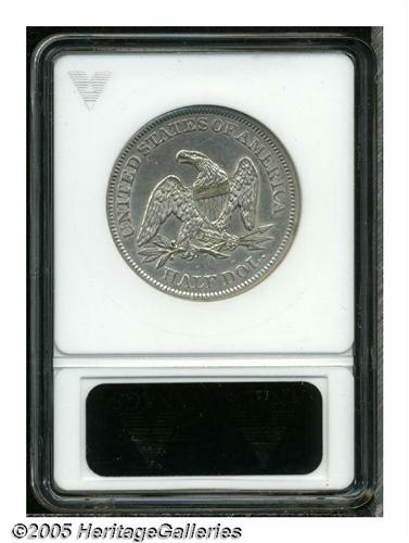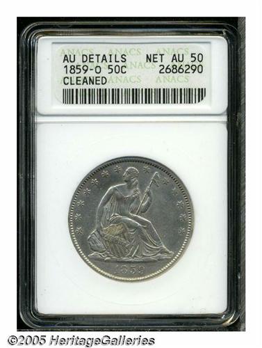 <B>1859-O<50C> AU50 ANACS.</B></I> Well struck with excellent details and mere traces of wear, on some of the highpoints of the design. This attractive New Orleans Mint product suffers minimally from the effects of an old cleaning, and displays only minor marks and faint hairlines, on either side, along with expectantly subdued luster.