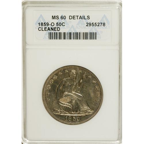 <B>1859-O 50C --Cleaned--ANACS. MS60 Details.</B></I> NGC Census: (2/92). PCGS Population (3/48). Mintage: 2,834,000. Numismedia Wsl. Price for NGC/PCGS coin in MS60: $345. (#6297)<BR><BR><b>Shipping:</b> Coins & Currency (<a target="_blank" href="http://www.heritageauctions.com/common/shipping.php">view shipping information</a>)