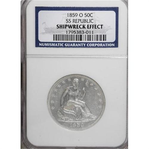 <B>1859-O 50C Shipwreck Effect NGC.</B></I> Ex: S.S. Republic. This stone-white New Orleans No Motto half has only a trace of actual wear, but the fields are minutely granular, particularly on the upper reverse. A box and certificate of authenticity accompany the lot.<BR><BR><B>Coin Engraver:</B> Christian Gobrecht<BR><BR><b>Shipping:</b> Coins & Currency (<a target="_blank" href="http://www.heritageauctions.com/common/shipping.php">view shipping information</a>)