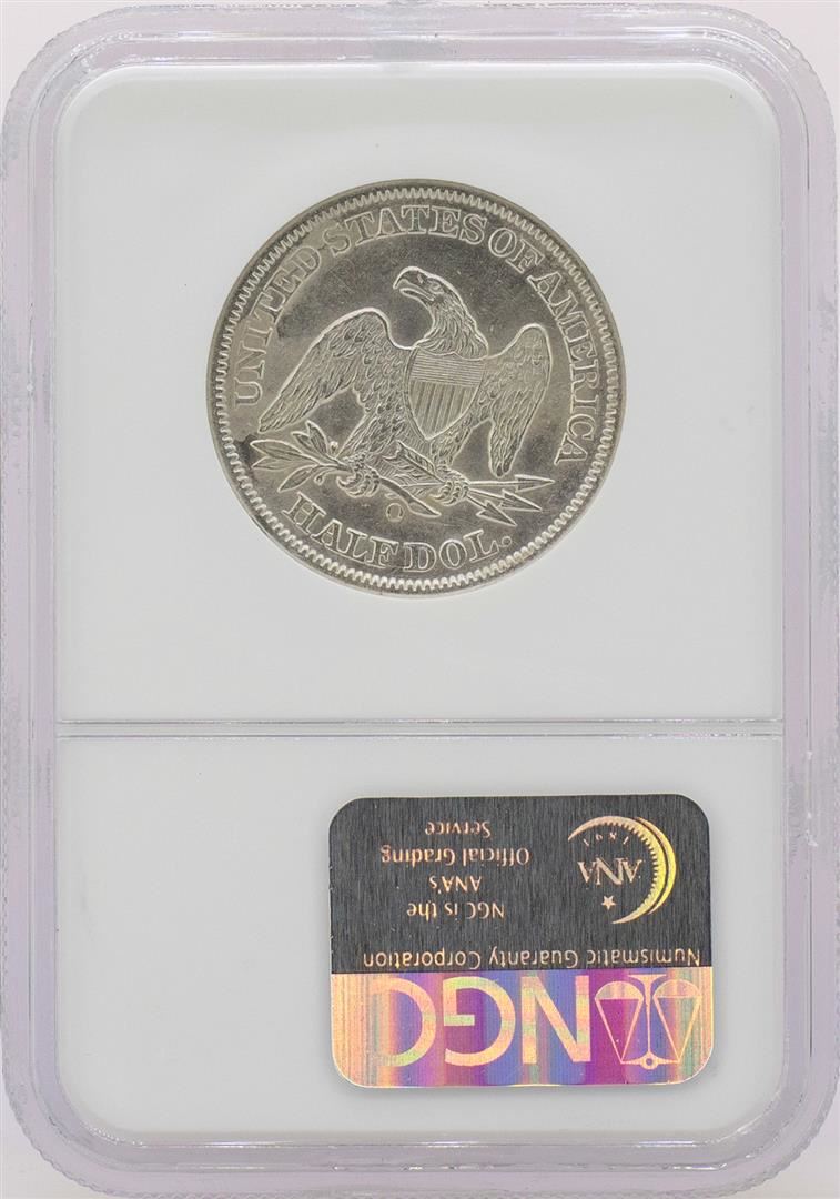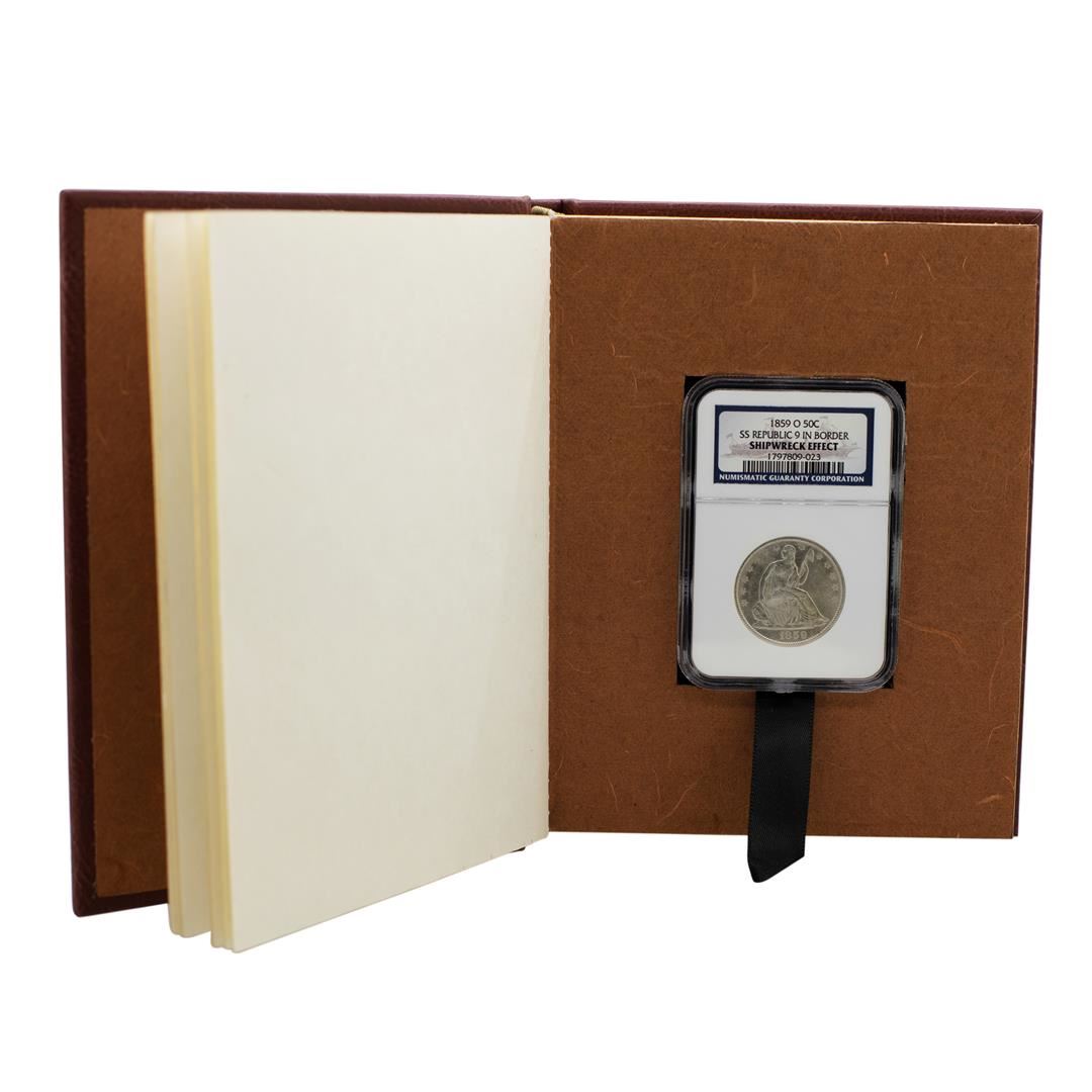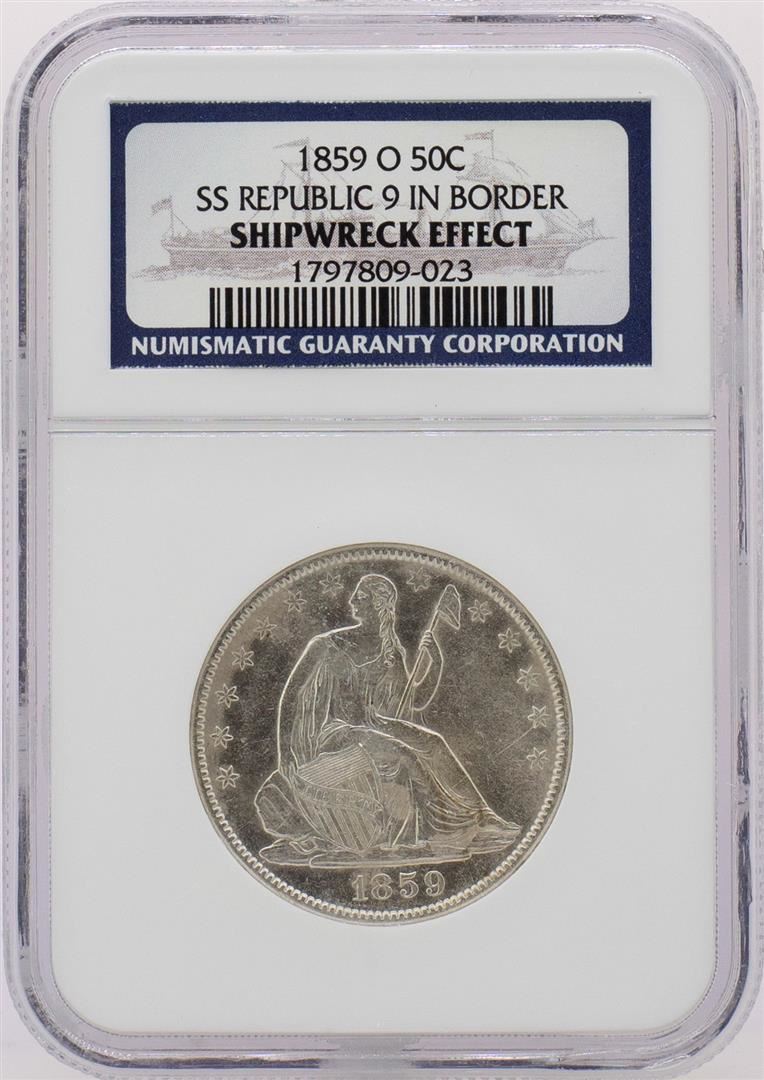 One 1859-O 9 in Border Seated Liberty Half Dollar Coin NGC Shipwreck Effect w/ Book. NGC Certified.