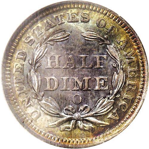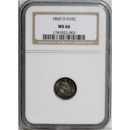<B>1859-O<H10C> MS66 NGC.</B></I> A better date among With Stars half dimes and one of the few affordable New Orleans coins of the type. Mint luster is the dominant visual attraction on this coin, in spite of the rich tonal qualities seen on each side. Both obverse and reverse show subtle gradations of blue, indigo, and golden-yellow, but these layers of color cannot suppress the strong underlying mint frost. Well, but not fully struck, there are no obvious or distracting abrasions on either side. Census: 3 in 66, 1 finer (7/06).