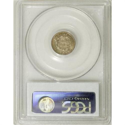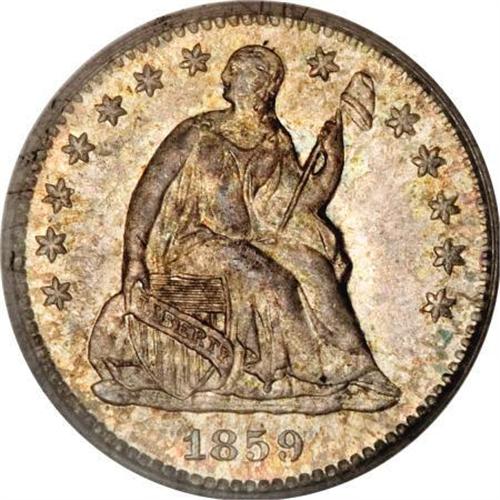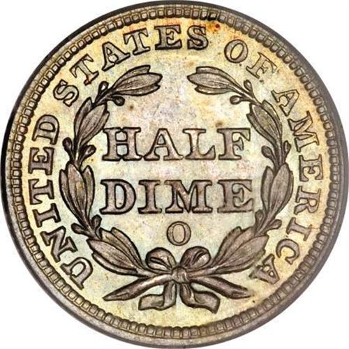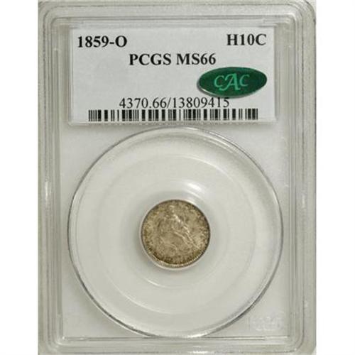 <B>1859-O H10C MS66 PCGS. CAC.</B></I> The 1859-O half dime is a slightly better date. Al Blythe, in his Seated Liberty half dime reference (1992), assigns an R.4 rating to these coins in Mint State. Splashes of aqua-green, golden-tan, and lilac visit the obverse, while aqua-green and greenish-gold dominate the reverse. Well struck with lustrous and gorgeously undisturbed surfaces. Population: 4 in 66, 0 finer (3/08).<BR><BR><B>Coin Engraver:</B> Christian Gobrecht<BR><BR><b>Shipping:</b> Coins & Currency (<a target="_blank" href="http://www.heritageauctions.com/common/shipping.php">view shipping information</a>)