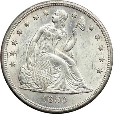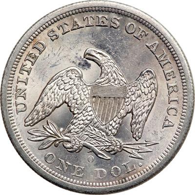 1859-O Liberty Seated Dollar. PCGS graded MS-61. Normal bagmark scuffs in the otherwise extensive satin frost. Both sides are well struck in the centers; a few rounded stars as commonly seen with '59-O. A bag or two of these surfaced in the 1960s and it is from these that the specimens on the market usually trace (PCGS # 6947) .