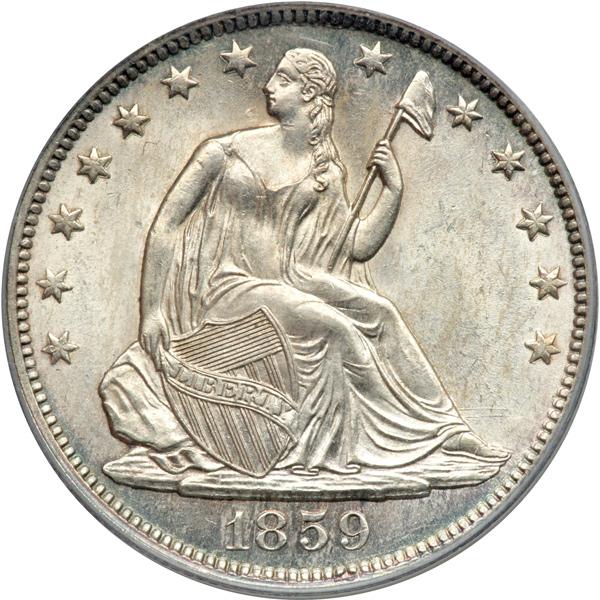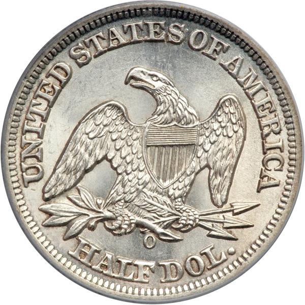 1859-O Liberty Seated Half Dollar. PCGS graded MS-64. Well struck and mostly white, the surface frosty from the center to the rim. A hint of light tone on the obverse. Pop 8; 10 finer (PCGS # 6297) .