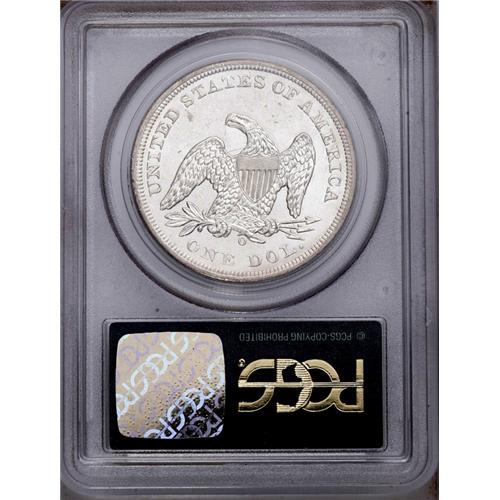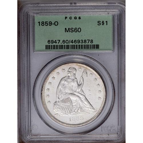 <B>1859-O<img border='0' src='http://www.heritagecoins.com/images/star.gif' width=10 height=10>$1> MS60 PCGS.</B></I> A brilliant and flashy O-mint silver dollar with a pleasing strike and a few moderate bagmarks on the right obverse field. Scarcer than the 1860-O, which also emerged from Treasury hoards during the early 1960s. Encapsulated in a green label holder.