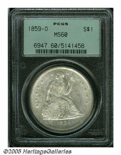 <B>1859-O<S$1> MS60 PCGS.</B></I> Outstanding mint luster and sharply struck with the usual accompaniment of abrasions this issue is known for. A bright frosty sheen and brilliant, snow-white surfaces.<BR><I>From The Dr. John L. Pellegrini Collection of Liberty Seated Dollars.</B></I>