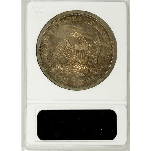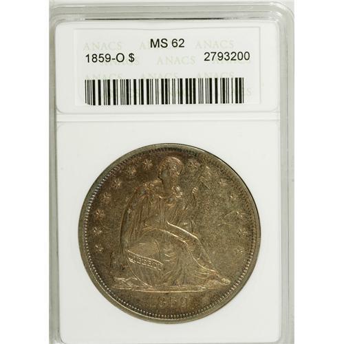 <B>1859-O S$1 MS62 ANACS.</B></I> This mildly prooflike No Motto type coin is draped in luminous golden-rose toning. Well struck and only lightly abraded. A minor retained lamination is present above the eagle's head.<BR><BR><b>Shipping:</b> Coins & Currency (<a target="_blank" href="http://www.heritageauctions.com/common/shipping.php">view shipping information</a>)