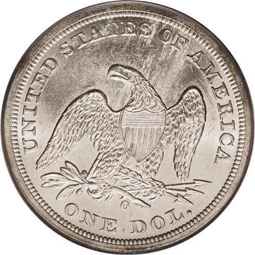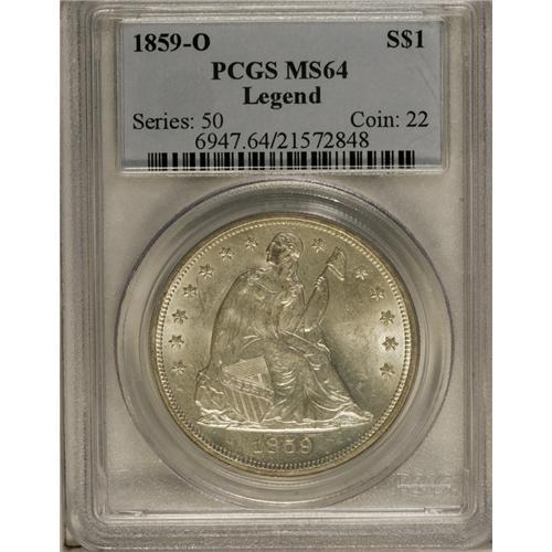 <B>1859-O S$1 MS64 PCGS.</B></I> Ex: Legend Collection. Sharply defined with radiant luster and a fully brilliant appearance overall. Unlike the majority of uncirculated 1859-O dollars, the surfaces are refreshingly free of most abrasions. Surely one of the best preserved coins to come out of the government release in the 1960s. Nearly all of the Treasury Hoard coins have heavy bagmarks, fully dissimilar to this near-Gem. Population: 16 in 64, 1 finer (10/06).<BR><BR><b>Shipping:</b> Coin/Currency (<a target="_blank" href="http://www.heritageauctions.com/common/shipping.php">view shipping information</a>)