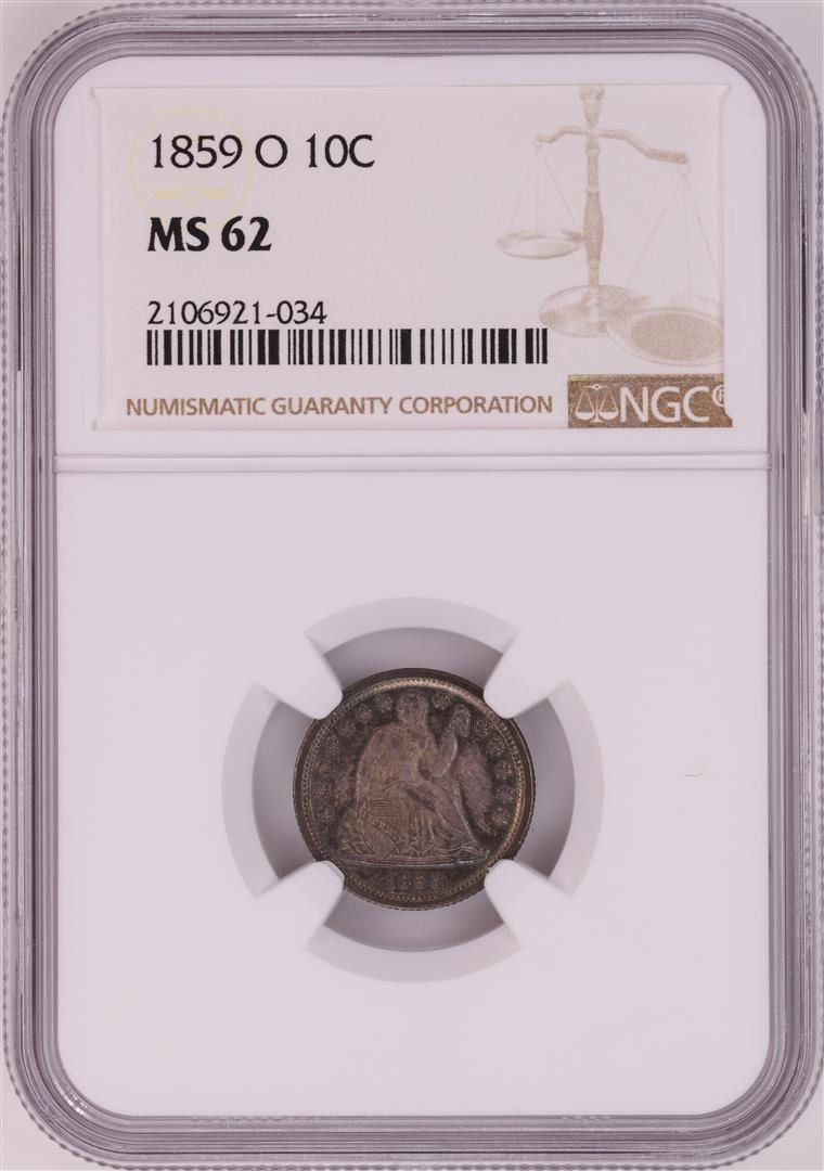 One 1859-O Seated Liberty Dime Coin NGC MS62. NGC Certified.