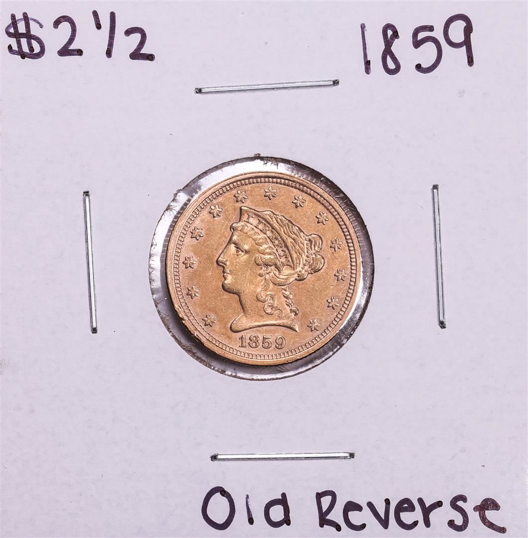 One 1859 Old Reverse $2 1/2 Liberty Head Quarter Eagle Gold Coin.