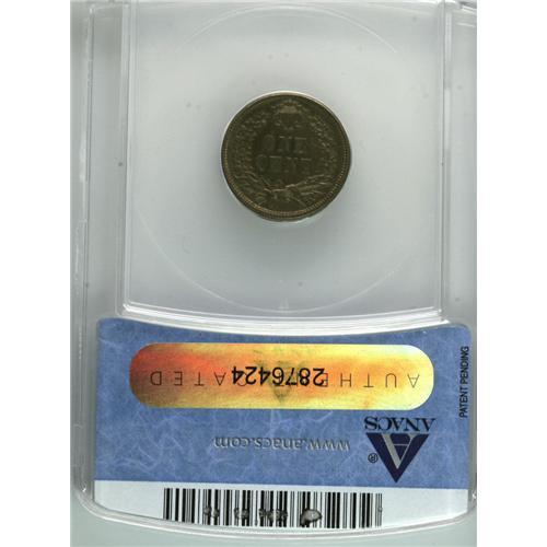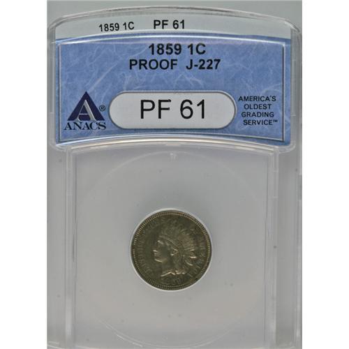 <B>1859<P1C> Indian Cent, Judd-227, Pollock-271, Low R.6, PR61 ANACS.</B></I> The regular issue obverse of the Indian cent, but the reverse has a highly ornamental scroll at the top of the oak wreath. Struck in copper-nickel with a plain edge, despite the Judd pattern reference, eighth edition, which says "reeded edge." (The edge is clearly visible through the new, recently redesigned ANACS holder.) This medium-brown example lacks sharpness on some of the feather tips and shows a light contact mark in the left obverse field.