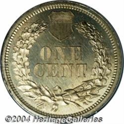 <table><tr><td><table><tr><td>1859 P1C Indian Cent, Judd-228, Pollock-272, R.1, PR64 PCGS. Dated 1859 but with the reverse of 1860-1909. Struck in copper-nickel with a plain edge. These exist in business strike and proof formats and are often incorporated with regular Indian cent collections. This piece has flashy orange-tan fields with considerable mint luster over the devices. Limited in grade by a few specks of carbon, most notably on the obverse. <BR><BR><B>Important notice:</B> Heritage usually auctions material at the rate of 200-250 lots per hour. On some occasions eBay Live bid software or the Internet may not be able to keep up with the pace of the auction. We recommend placing a realistic absentee bid now as insurance to avoid disappointment. Occasionally the auctioneer may eliminate or reject an eBay Live bid, and the auctioneer may also reopen a lot after the close of the eBay live bidding (usually because we missed an audience bid), and may reject your bid even if it shows you as the winning bidder. By bidding via eBay Live, you agree that Heritage may award the lot to another bidder at its sole discretion under the circumstances described above or any other reasonable circumstances. Since eBay bids are not shown to us until we open the lot on the floor, we treat those bids just like floor bids. In most cases the floor responds before the eBay bid is presented to us, due to Internet lag time, so for consistency we have made it a policy that floor bids are always considered first over tie eBay live bids. Also please note that all Heritage lots purchased through eBay Live carry a 20% Buyer's Premium. Please make sure you read the Terms and Conditions before you bid. <BR><BR><B>IMPORTANT ANNOUNCEMENT ABOUT RESERVES:</B> Heritage now divulges all reserves on its web site 7 days before every auction. If you want to know whether the reserve on this lot has been met, and if not, what the reserve amount is, please visit this lot page on the HeritageCoin.com web site, or email: bid@HeritageGalleries.com </span></font></td></tr></table></td></tr></table>